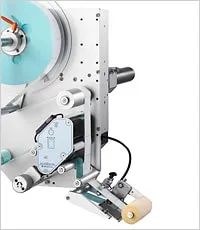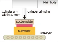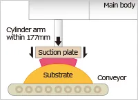 Pasting by extending cylinder arm with label absorbing head. It pastes when the product stops moving. It is suitable for jobs requiring accuracy in pasting position.