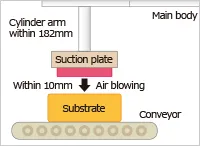 Attach by blowing air near the product with a cylinder. Suitable for pasting without stopping the transport to lightweight objects.