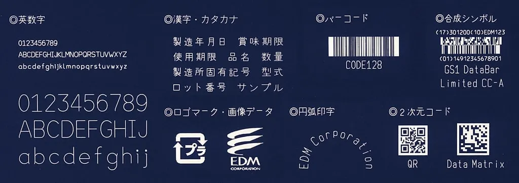 小文字から、GS1 DataBarをはじめとした各種バーコード、二次元コードまで多様な印字に対応します。